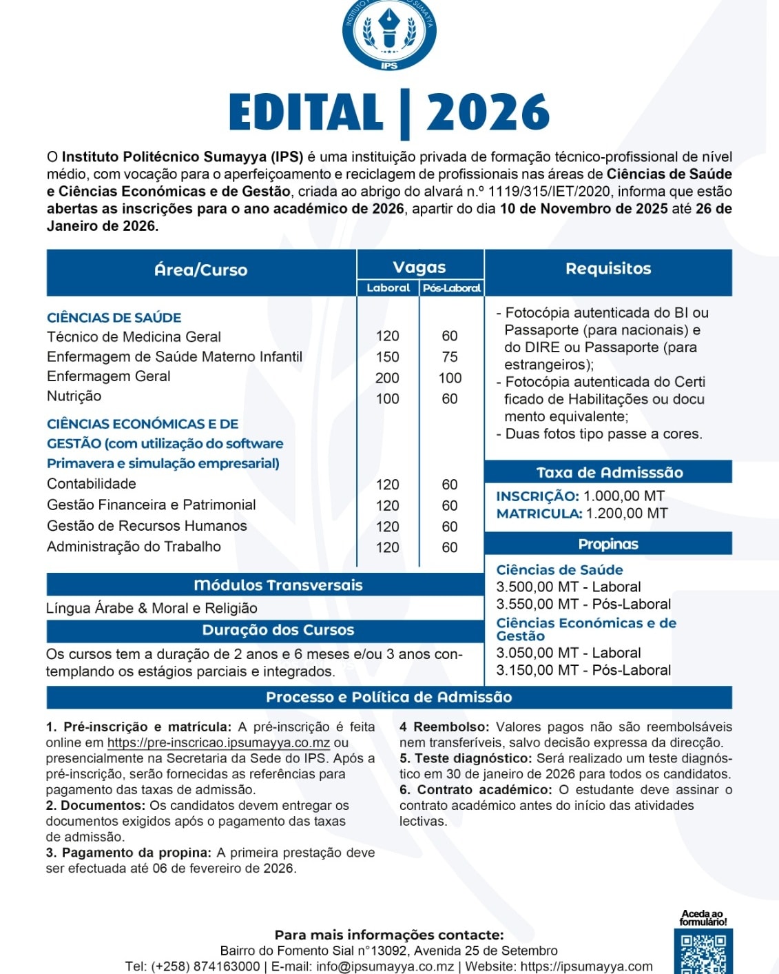 Já está disponível o Edital de Inscrições 2026 do Instituto Politécnico Sumayya! Consulta todos os detalhes e prepara-te para garantir a tua vaga. #IPS #Inscricoes2026 #EducarParaTransformar...